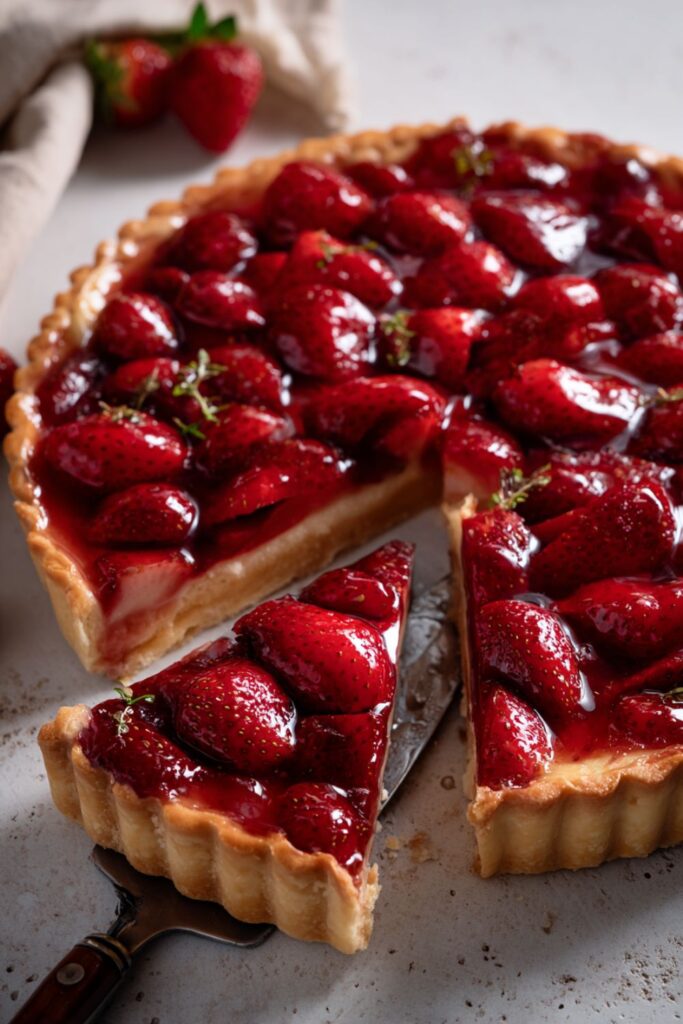 - Arrange the fruit: Place half the strawberries in the baked crust.
