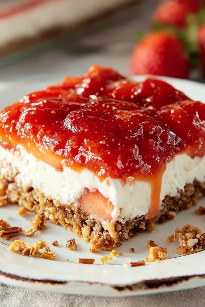 A beloved classic dessert featuring a crunchy, salty pretzel crust, a sweet and tangy cream cheese layer, and a refreshing strawberry gelatin topping.